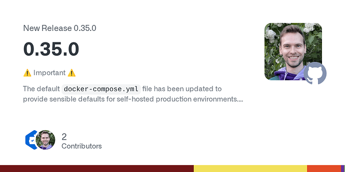 The default docker-compose.yml file has been updated to provide sensible defaults for self-hosted production environments. This should not break existing setups, but it’s recommended to review your docker-compose.yml file and update it accordingly.